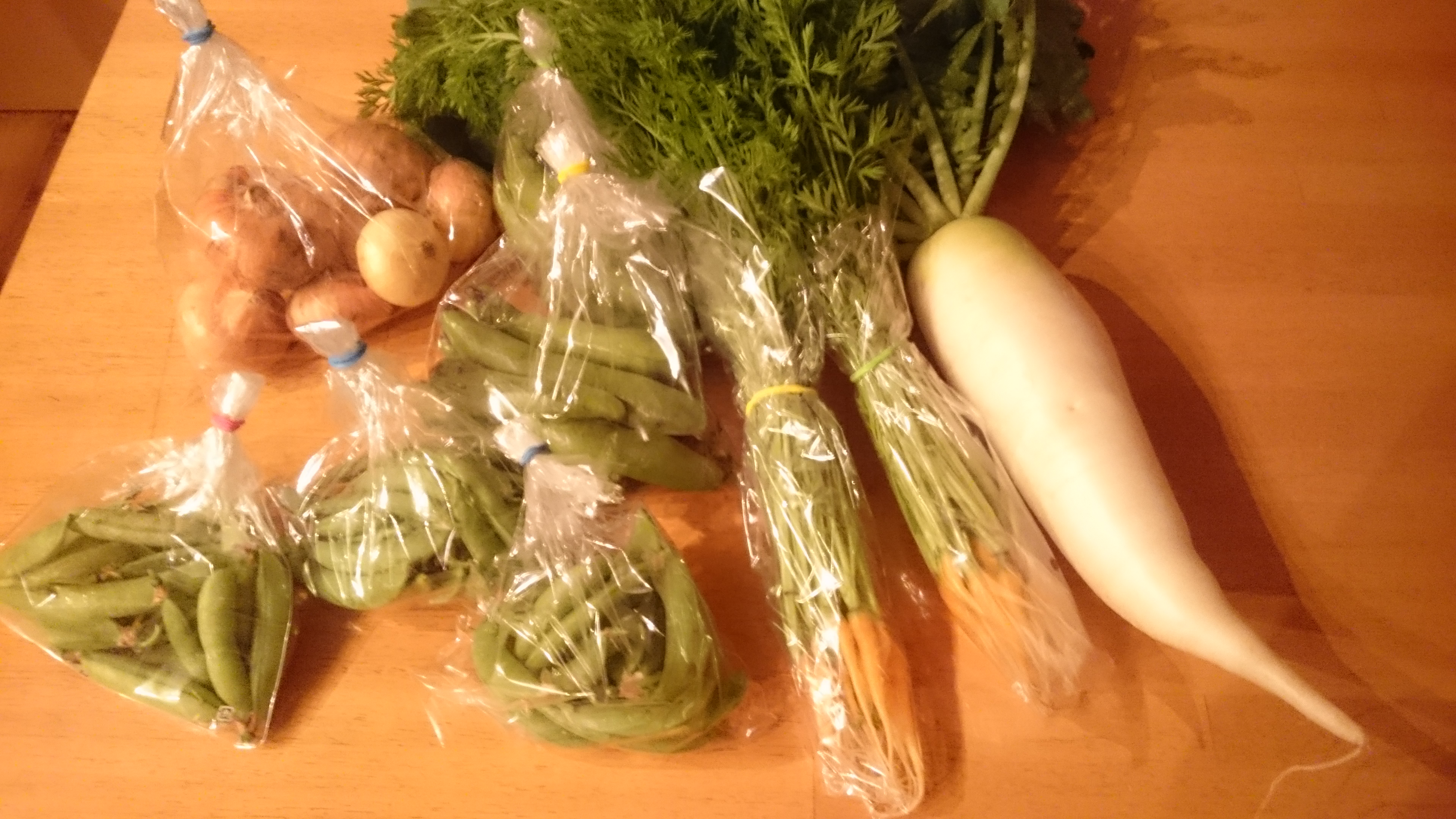 大根、間引き人参、そら豆、玉ねぎ、