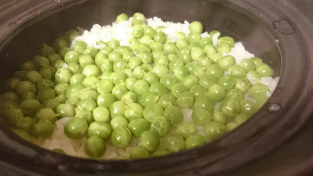 お米2合に実えんどうを一袋と塩だけの土鍋ごはんです