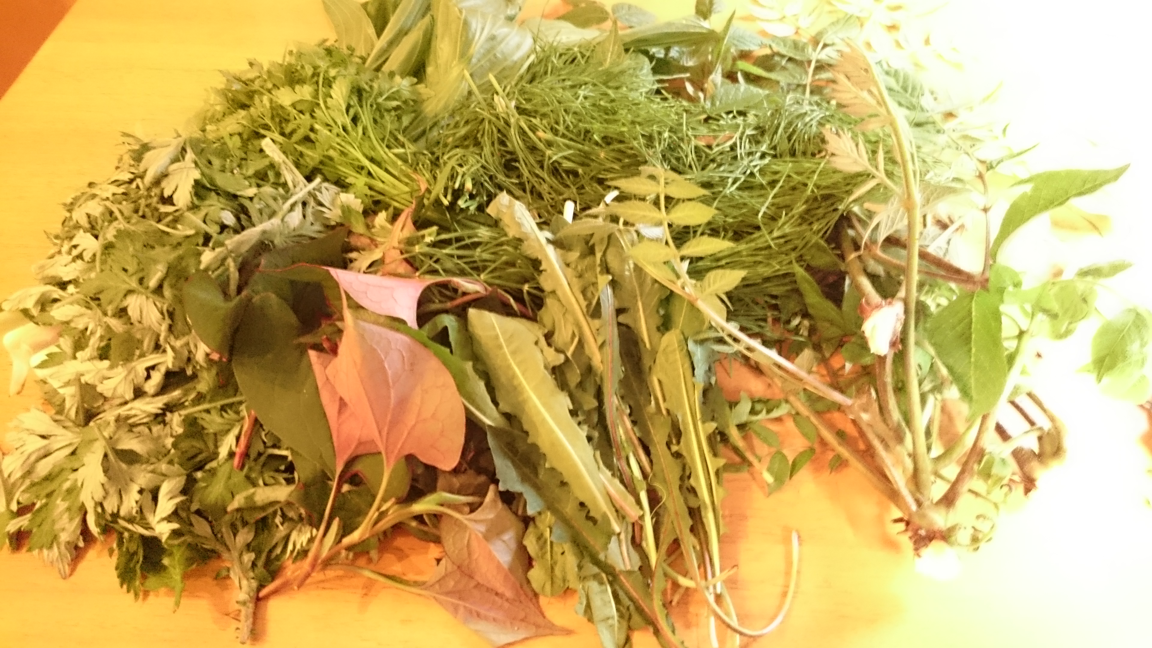 (今回は、ヨモギ、スギナ、どくだみ、タラの芽、うるい、セリ、タンポポの葉)